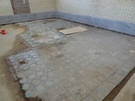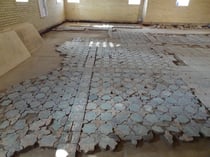 Après séchage et nettoyage autour des carreaux (mortier partiellement sec, poussière, etc.), des joints ont été réalisés. Du mortier liquide a été posé sur toute la surface des carreaux pour bien imprégner les espaces parfois très faibles entre chaque carreau. Après séchage, le mortier résiduel a été retiré à l’éponge. Les joints donnent une meilleure tenue à l’ensemble et un aspect « fini ». Enfin, des solins, petites parois de mortier, ont été réalisés tout autour des pavements jusqu’à hauteur des carreaux, pour en stabiliser les bordures.
